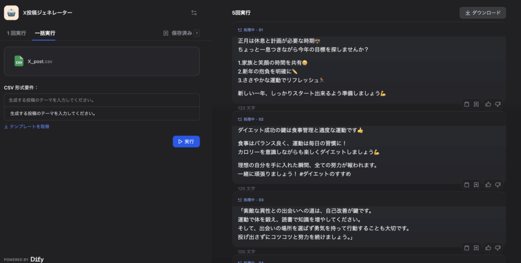 生成AIを使ってテキストジェネレーターをさわってみた。バッチ処理が本当にすごい。X投稿を5つのテーマで同時に自動生成してくれた。こういうのをみるとほんと感動する。